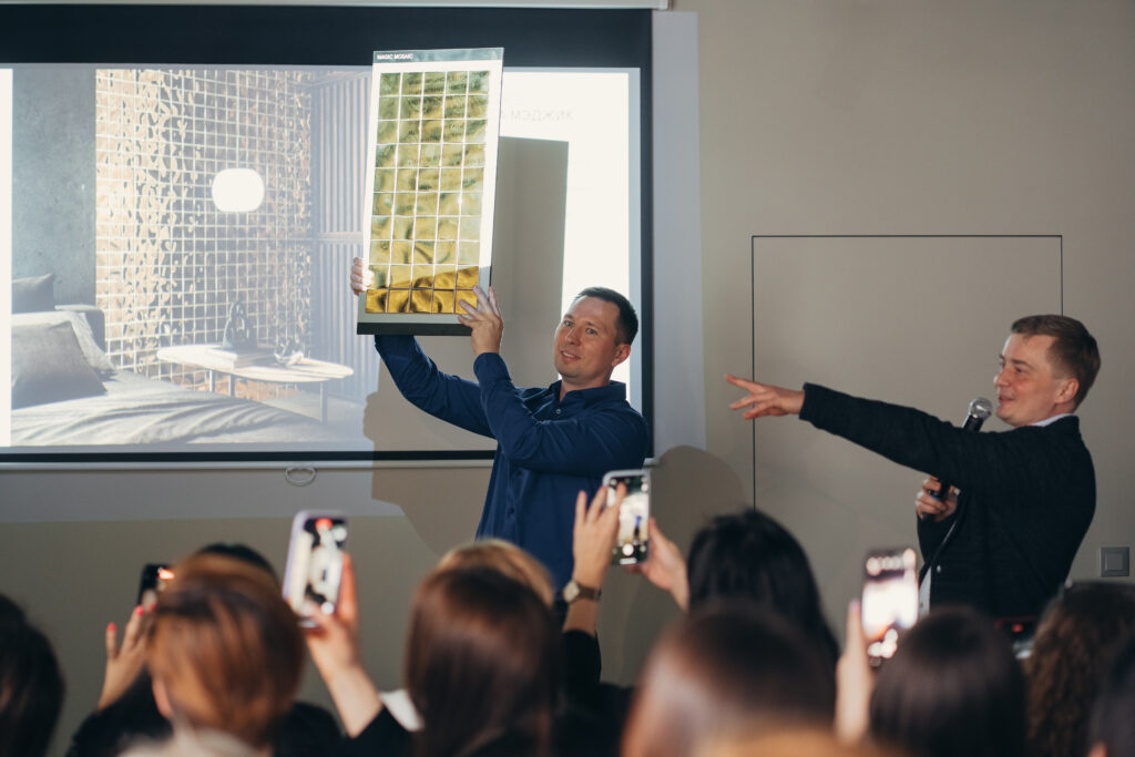 Представители фабрики Italon смогли наблюдать новое море: море улыбок и горящих глаз людей, вдохновленных яркими, дерзкими сочетаниями материалов, которые лежат в основе новинки. Кого может оставить равнодушным сочетание… эффекта шлифованного бетона и изумрудного мрамора? А бетона и сочной палитры мозаики Спектрум?