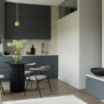 Так трендовому, но недолговечному покрытию – микроцемент – была найдена отличная альтернатива: керамогранит из коллекции Континуум. Он стал объединяющим элементом дизайна всех помещений. ТВ-зона в гостиной, кухонный фартук, а также стена за изголовьем кровати облицованы плиткой в оттенке Пьюр в оригинальной комбинации с мозаикой Стрип Пьюр 30х30. Санузел оформили более графично, выбрав для этого керамогранит в цвете Сильвер и Петрол для стен и мозаику Стрип Петрол 30х30 для акцентной зоны за раковиной, а на пол уложили самый светлый оттенок коллекции Континуум — Полар. Практичная натуральная поверхности плитки позволит заказчикам не переживать за износостойкость поверхностей, а лаконичный современный дизайн подарит долгожданный комфорт на долгие годы.