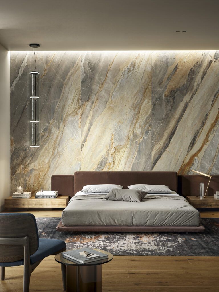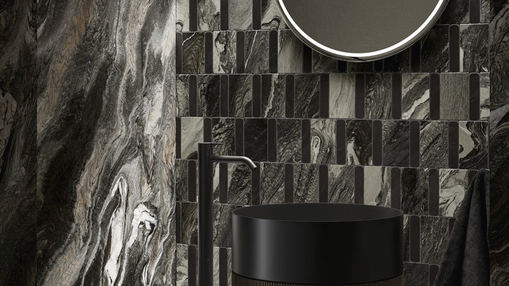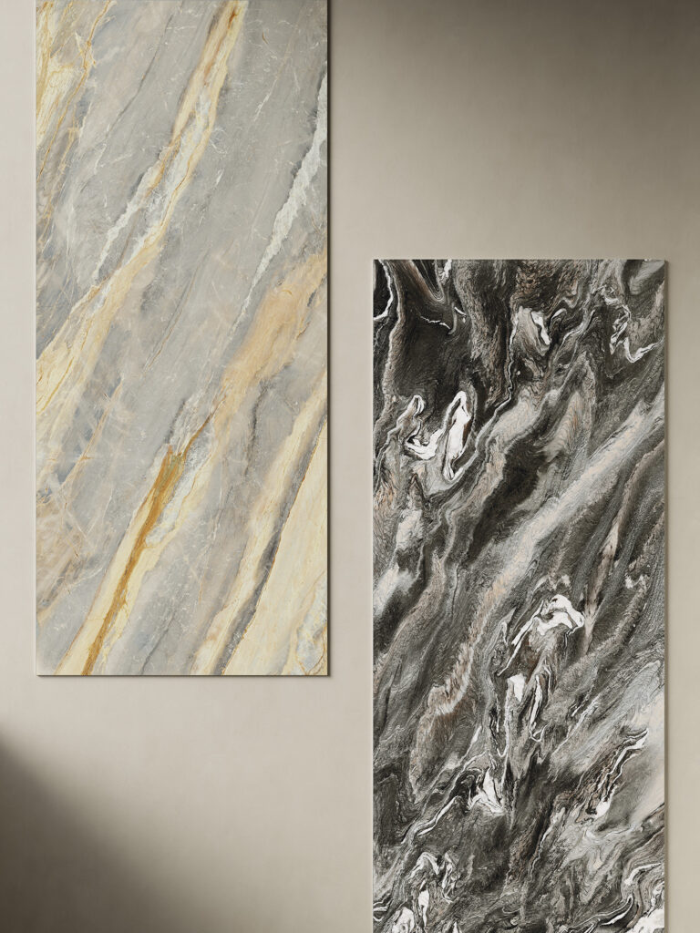 Мрамор, наоборот, добавляет характер. В нем больше графики, больше движения, и за счет этого он становится прекрасным акцентом. От сложной палитры серого и прожилок цвета слоновой кости у Калакатта Скай до глубокого, насыщенного темного фона Лава Гэлакси. Керамогранит под мрамор с выразительной графикой и уникальными цветовыми переходами подчеркнет утонченность проекта. А плиты макси-формата 120х278 см станут прекрасным решением для облицовки стен.