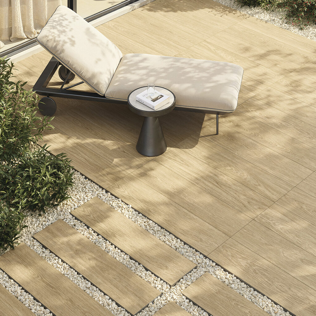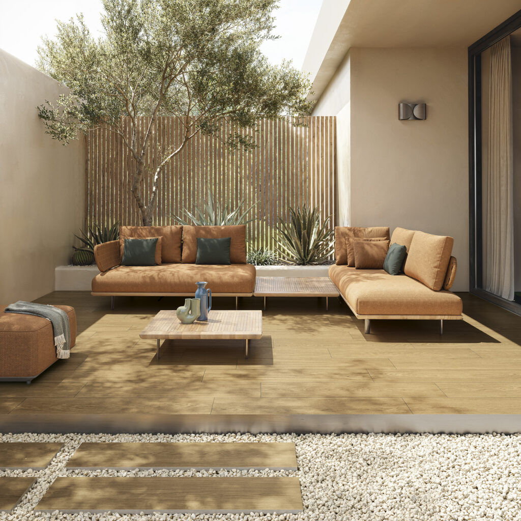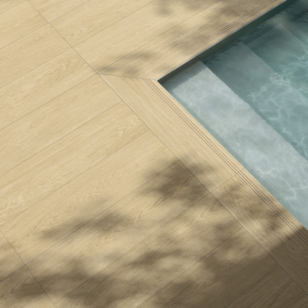 Стиль Аура Классик гармонично переходит из интерьера в экстерьер. Уличный керамогранит под дерево Italon X2 толщиной 2 см позволяет оформить террасы, патио и зоны у бассейна в единой стилистике с интерьером.
