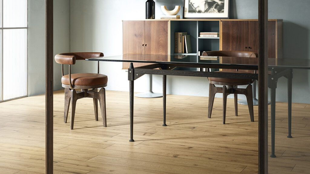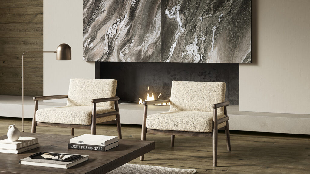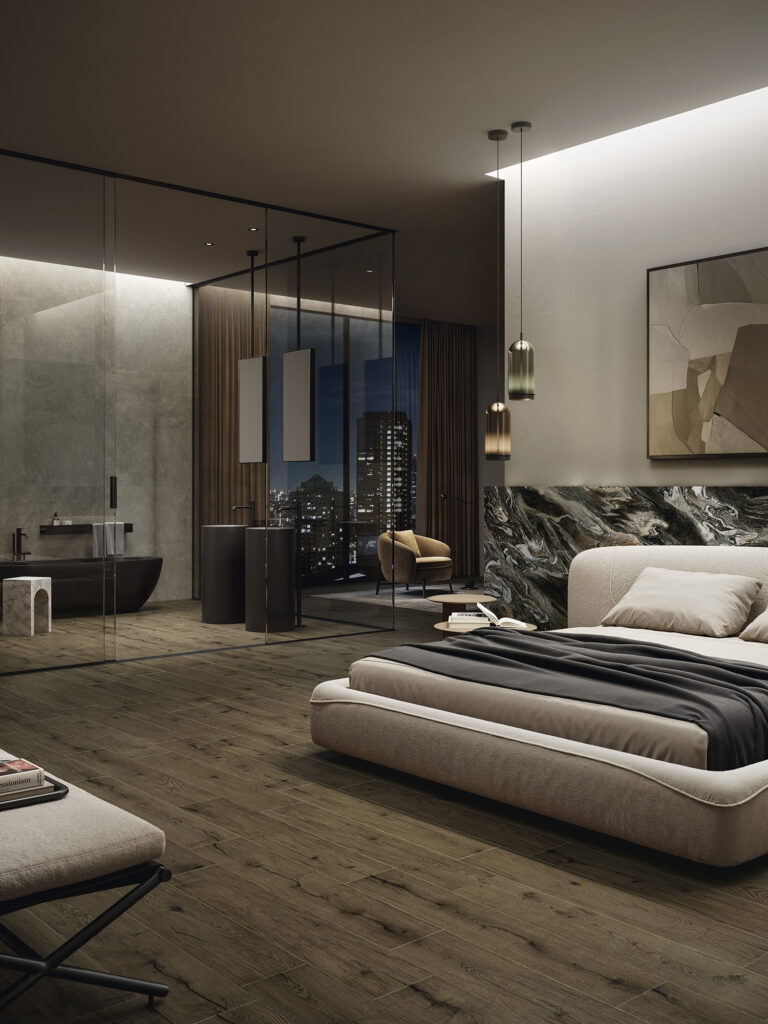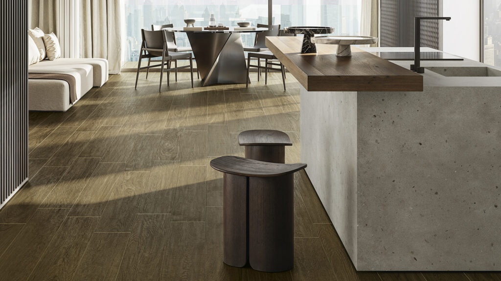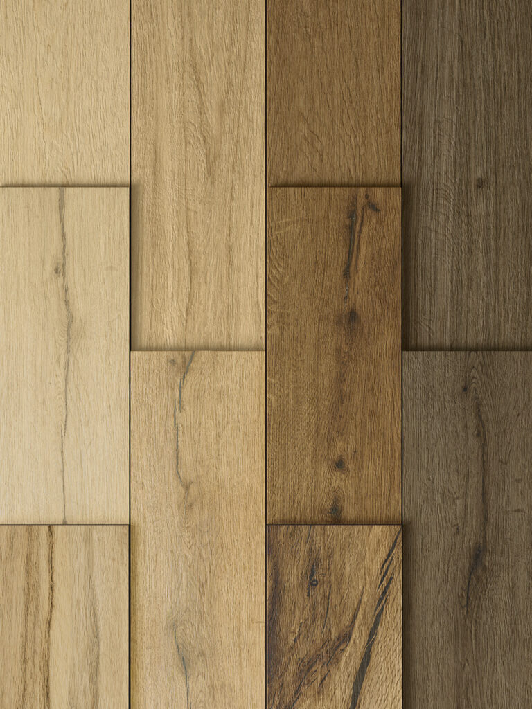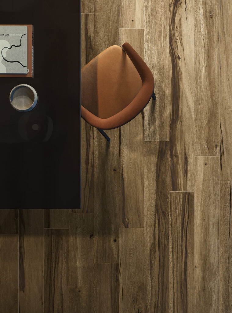 В основе коллекции — оттенки дерева, к которым сегодня чаще всего обращаются в архитектуре интерьеров. Десять вариантов графики плитки под дерево — от нейтральных и почти невесомых, до более глубоких, благородно состаренных — создают гармоничные сочетания с камнем, мрамором и декорами.