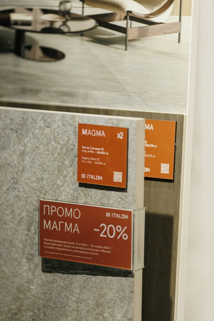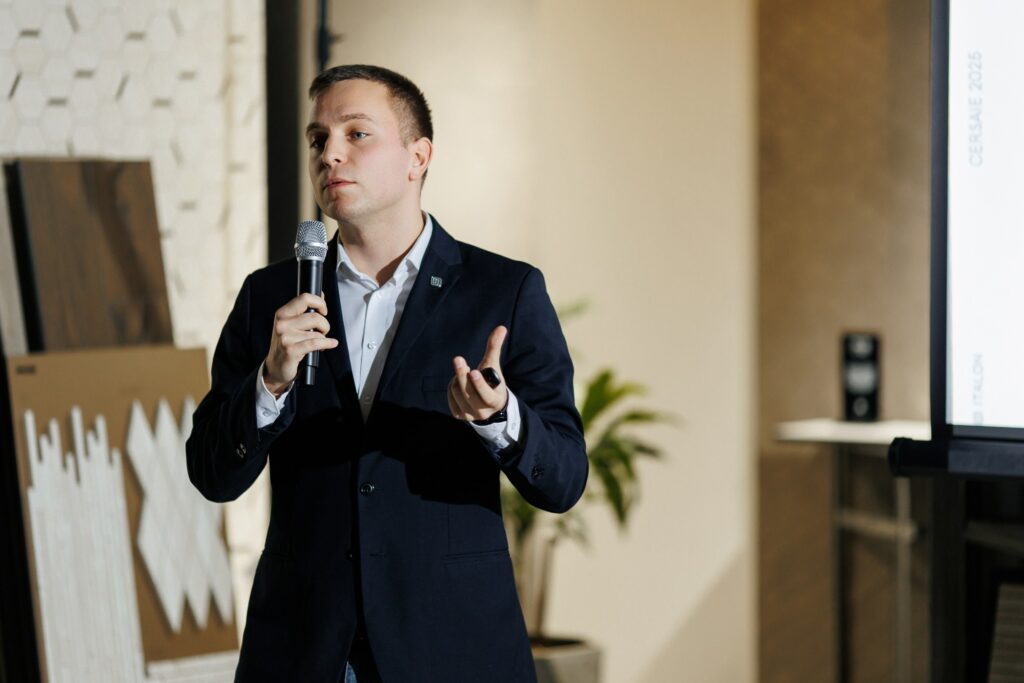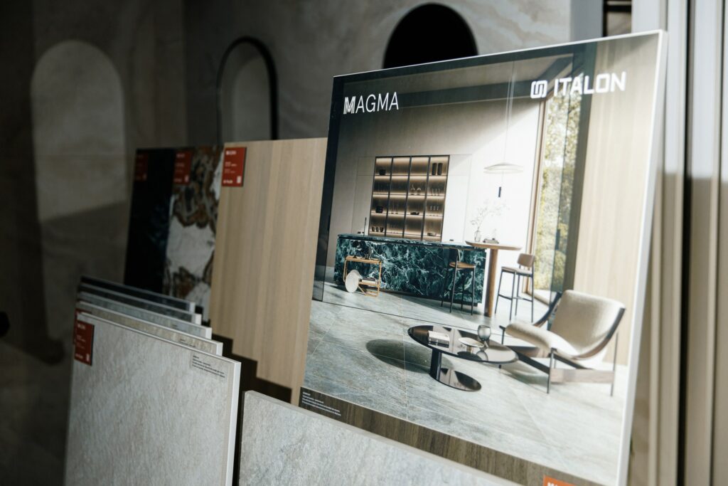 Но в самом начале, перед тем, как открыть завесу тайны, Александр и Станислав немного погрузили гостей в те тренды и тенденции, которые можно было заметить на прошедшей в сентябре керамической выставке Cersaie 2025. Это помогло лучше дизайнерам и архитекторам понять, какие продукты сегодня востребованы, а также понять, почему именно такие новинки демонстрирует Italon. После этого небольшого экскурса представители завода провели долгожданную презентацию новинки Magma, в основе которой лежит эстетика кварцита, камня с тысячелетней историей.