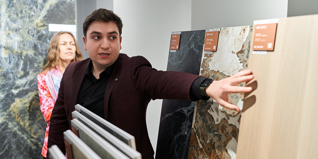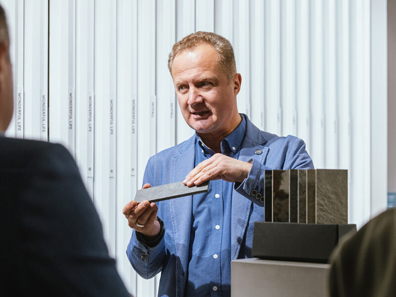 После презентации представители бренда вместе с гостями оценили плиту в реальности, отметив ее реалистичность и фактурность поверхности.