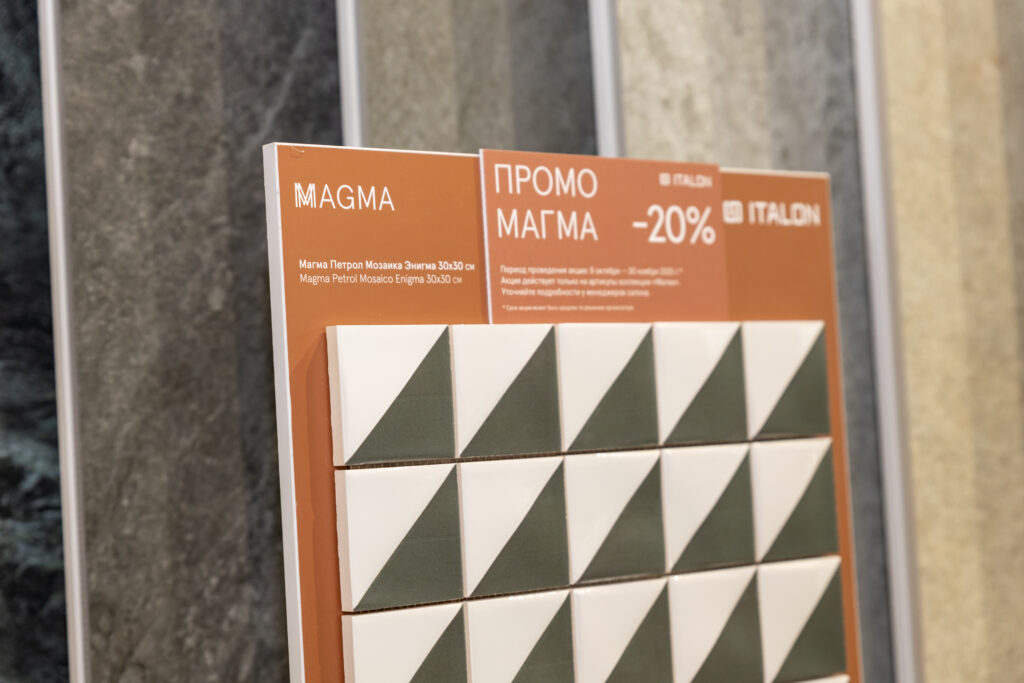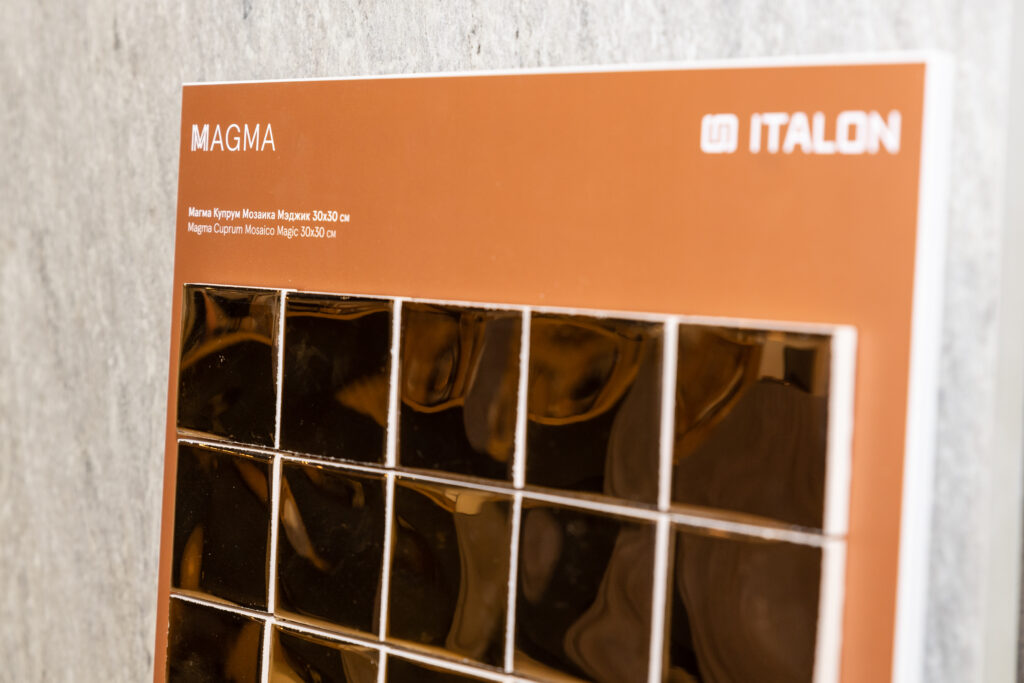 Изюминкой новой коллекции Magma стали декоры: Энигма Петрол и Мэджик Купрум с эффектом расплавленной меди. Особенностью мозаики Энигма Петрол стали ее квадратные чипы, визуально разделенные на 2 части: светлый треугольник выполнен в поверхности люкс, а темно-зеленый – матовый, что создает ярко-выраженный 3D-эффект.