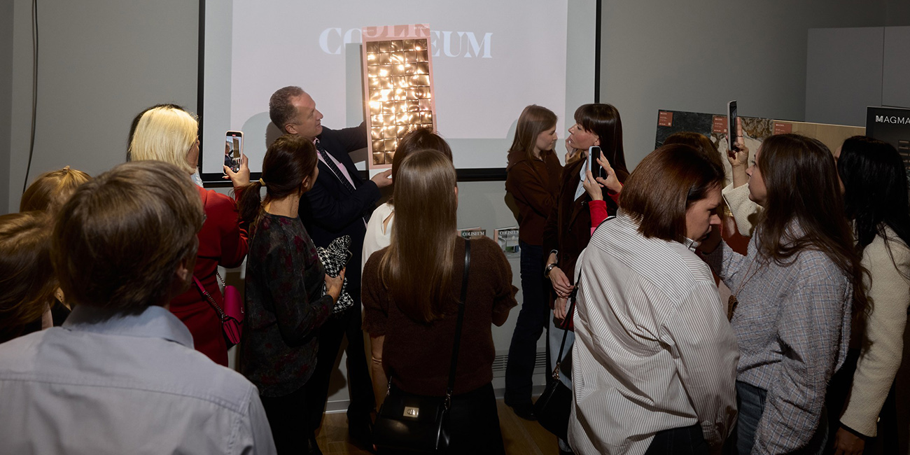 Олег Горюнов, представитель бренда, начал посвящение в новую коллекцию Magma с рассказа о международной выставке Cersaie-2025, где ежегодно представляют различные тренды в мире керамики. Гости, хоть и не были в этом году на выставке, но с интересом слушали и внимали каждое слово о том, какие технологии используются в создании самой реалистичной плиты, какие оттенки сейчас в моде, и что может предложить рынок керамики.