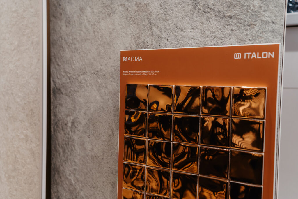Для поддержания природного баланса керамогранит под кварцит дополняет плита под мрамор в двух цветовых вариациях а также крупноформатный керамогранит под дерево в новом формате 120*278 в двух популярных цветах. Новинку осени также дополняют новые оригинальные декоры Мозаика Петрол и Мэджик Купрум, которые создавались специально для поддержания особого очарования коллекции Magma.