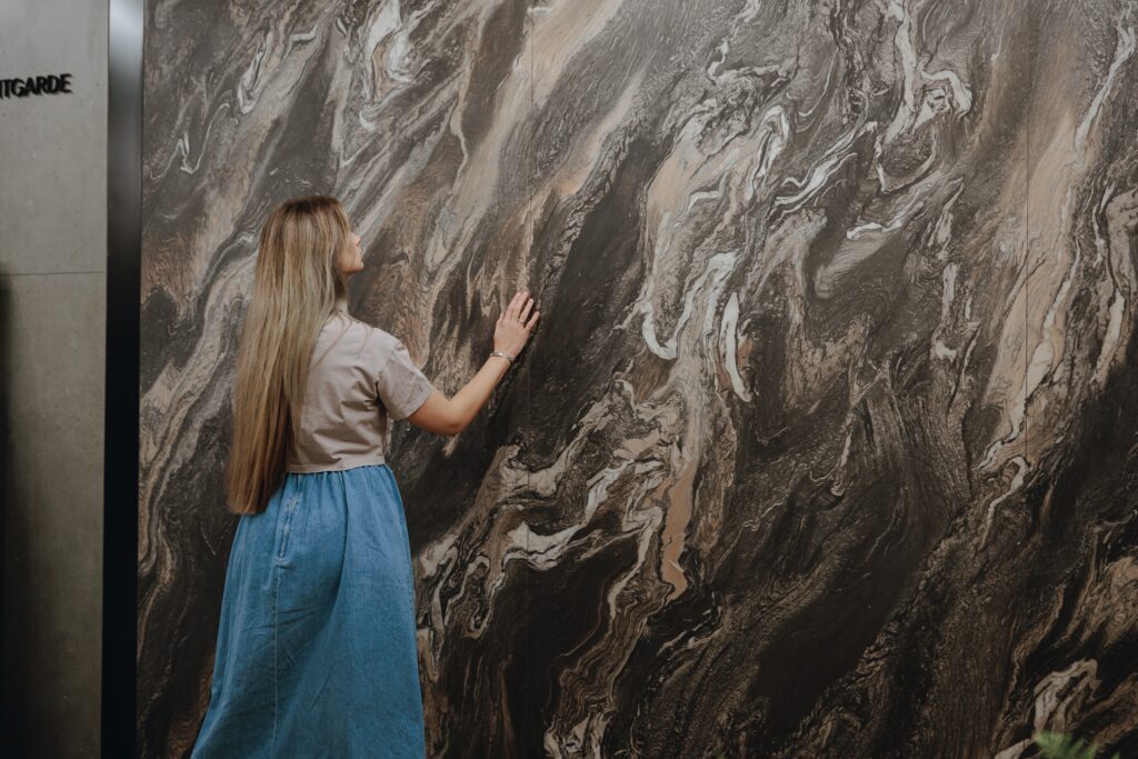 Далее взору профессиональной публики открылся мрамор, доступный в макси-формате 120*278 см, в поверхности силк. Поверхность силк поражает своей мягкостью и утонченностью, словно шёлк.