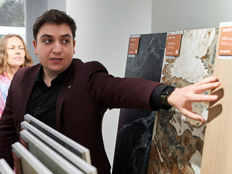 Руководитель отдела по работе с ключевыми клиентами Сергей Дьяконов вместе с официальным представителем Italon по Беларуси Александром Наумовым рассказали профессионалам отрасли об особенностях новых серий Charme Advance и Wonderful Life, а также раскрыли основные секреты при работе с плитами макси-формата 120х278.