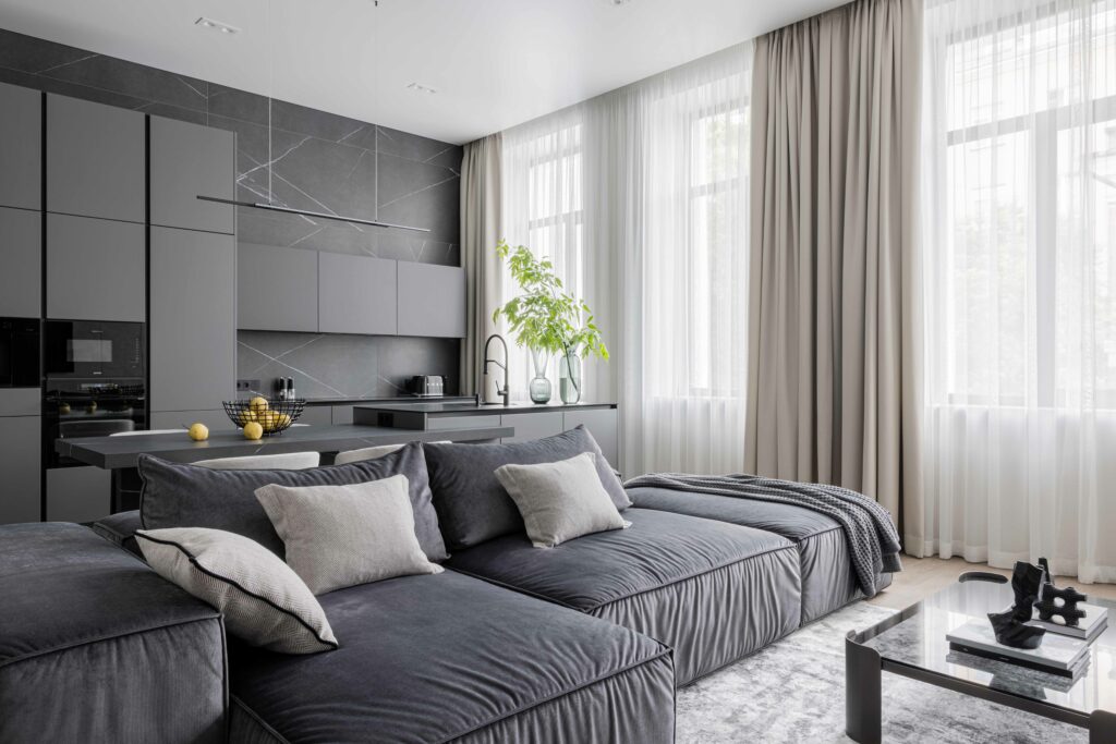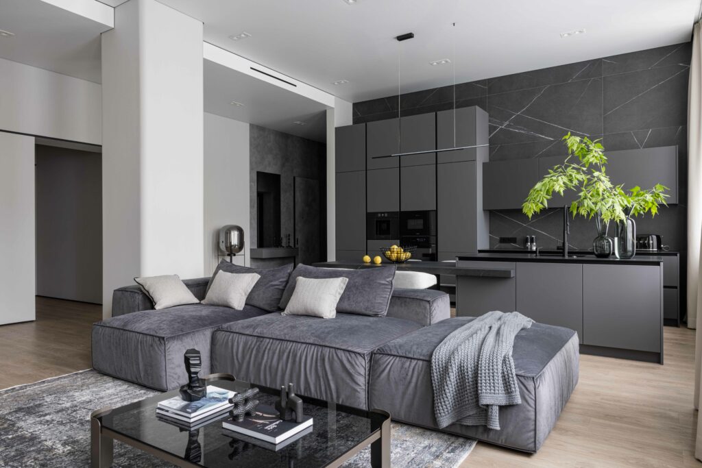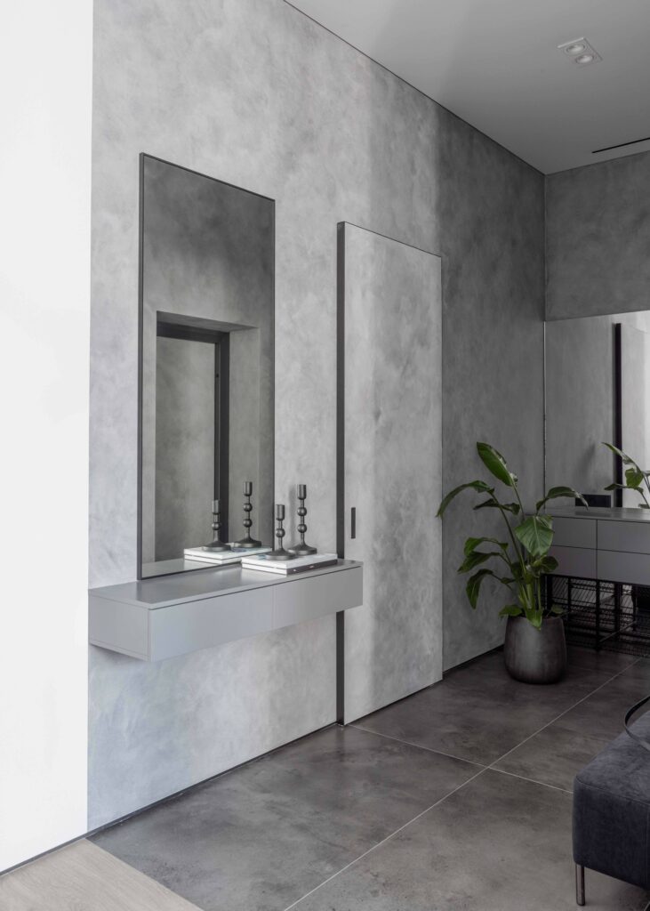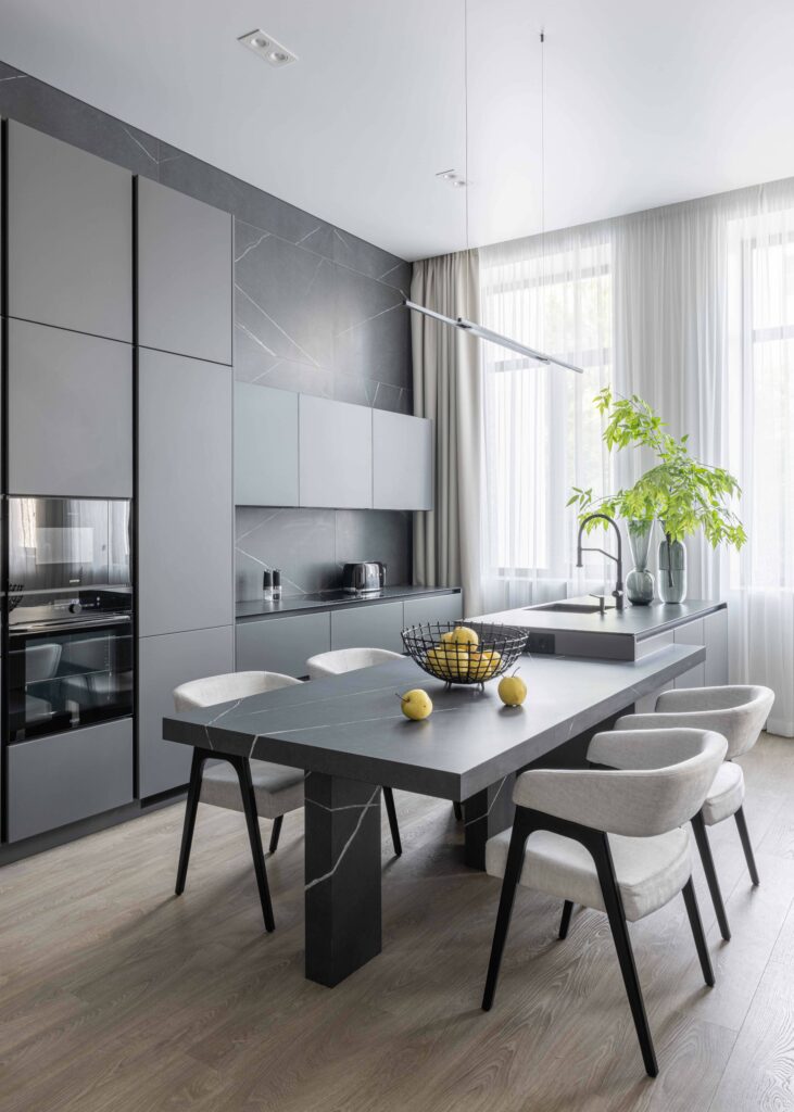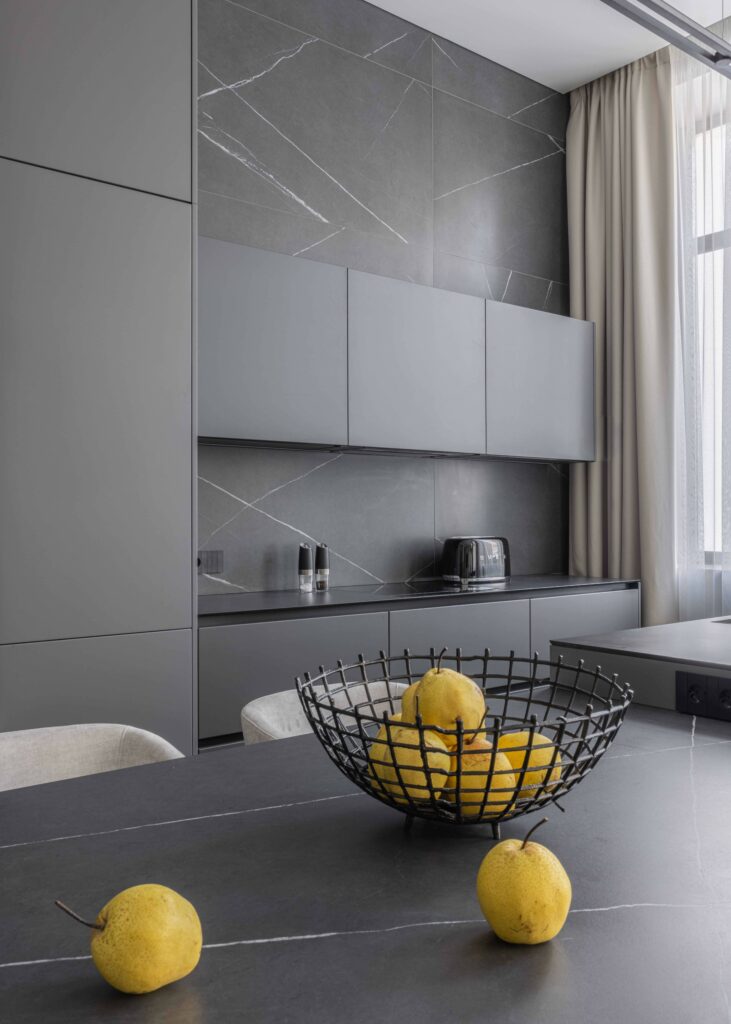 Керамогранит Italon стал одним из ключевых материалов, поддерживающих общую идею. В прихожей и гардеробной применён крупный формат Миллениум Блэк 80х160. На кухне важную роль играет Метрополис Империал Блэк: стол и остров, выполненные из ластры 120х278, подчёркивают масштаб помещения, а облицовка стен форматом 80х160 формирует выразительный архитектурный акцент.