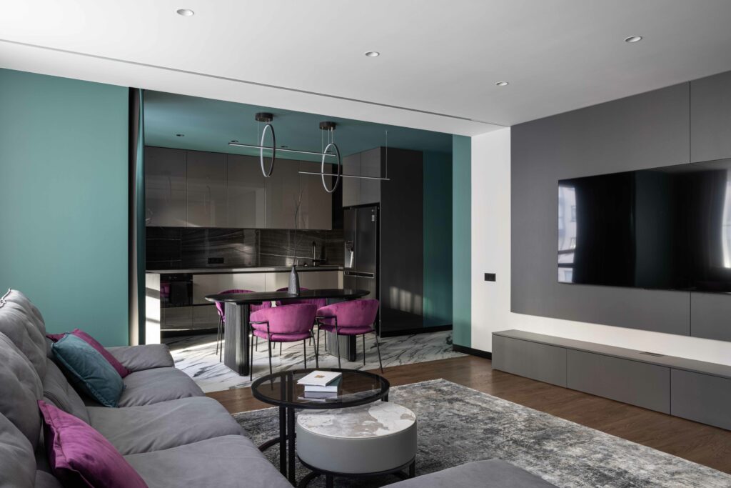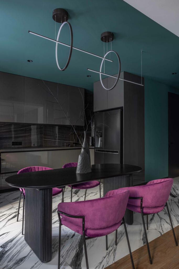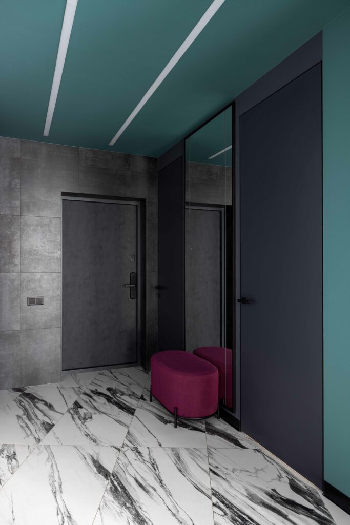 Эта малиново-зелёная квартира — один из самых цветных проектов студии. Цвет здесь работает как инструмент: корректирует геометрию, организует пространство и делает его выразительнее. Контрастная палитра определила выбор материалов: активный по рисунку керамогранит Шарм Делюкс Статуарио Фантастико подчёркивает графичность и логично продолжает концепцию проекта. Глянцевый Surface Аструс на кухонном фартуке вносит дополнительную динамику в интерьер. Покрытия Серфейс Стил в прихожей и кабинете вместе с Auris Графит в санузлах формируют спокойный, чистый фон, визуально связывая все зоны в цельный образ.