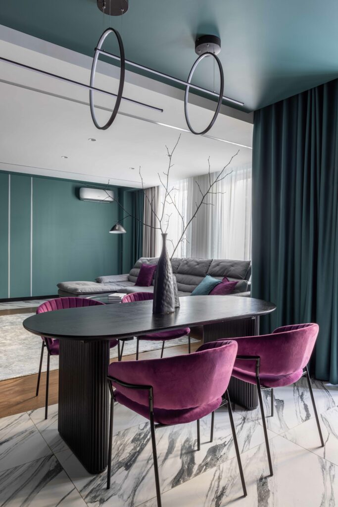 Комбинация сложной планировки, смелого цвета, продуманного света и материалов формирует интерьер, который не просто эффектно смотрится на фотографиях, а соответствует характеру хозяев и в прямом смысле живёт «по своим правилам».