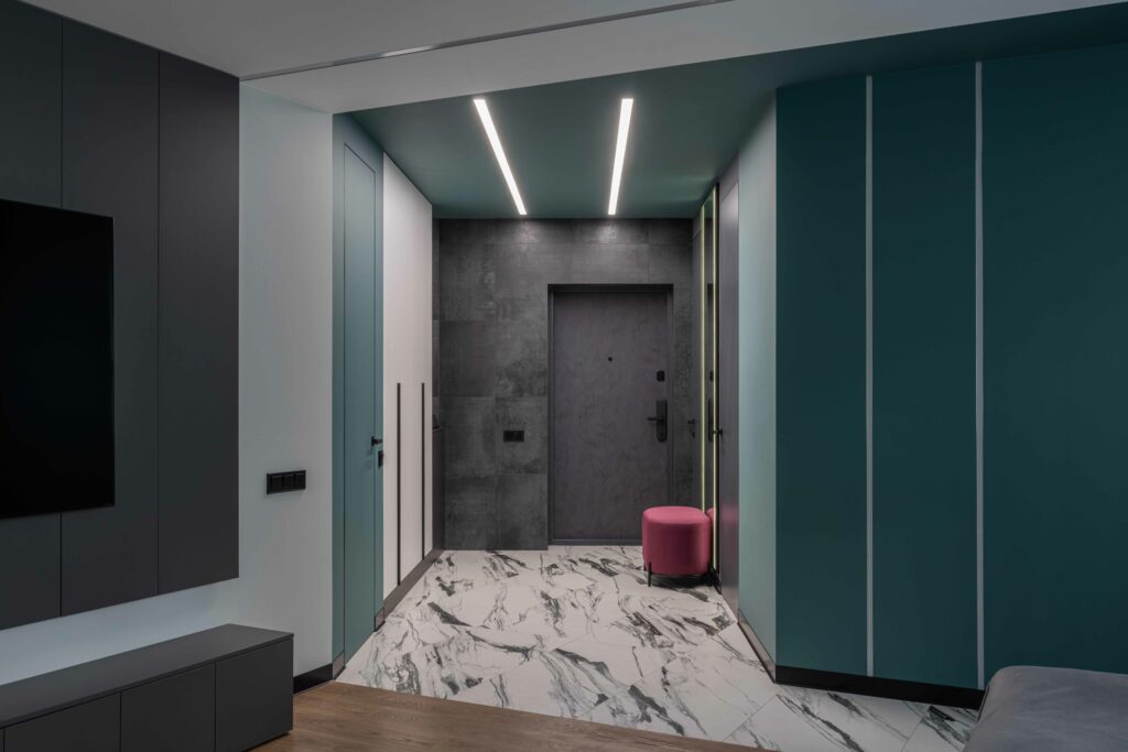 Свет — ещё один ключевой инструмент. В интерьере много разных сценариев: линейные подсветки, переходящие с потолка на стены, и акцентные светильники подчёркивают ломаную геометрию и задают ритм пространства.
