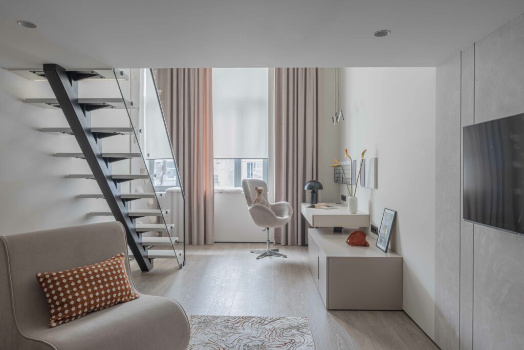 Одним из самых заметных решений в квартире стала комната дочери. Её превратили в небольшую мини-квартиру: внизу разместили рабочее место и гостиную, а на антресольном этаже — спальню и скрытую гардеробную. В результате комната стала функциональнее и лучше адаптирована под потребности ребёнка.