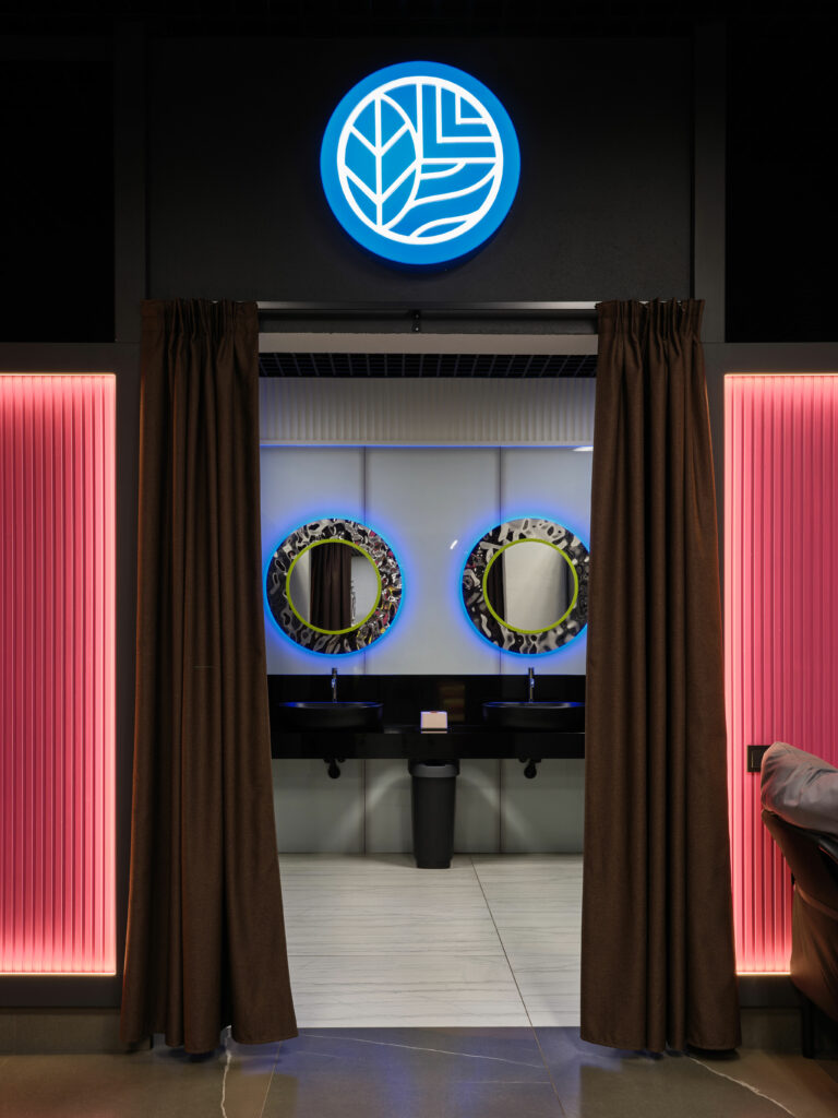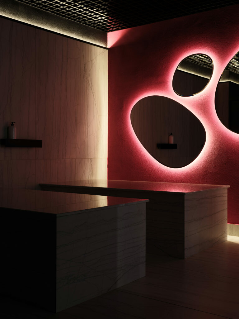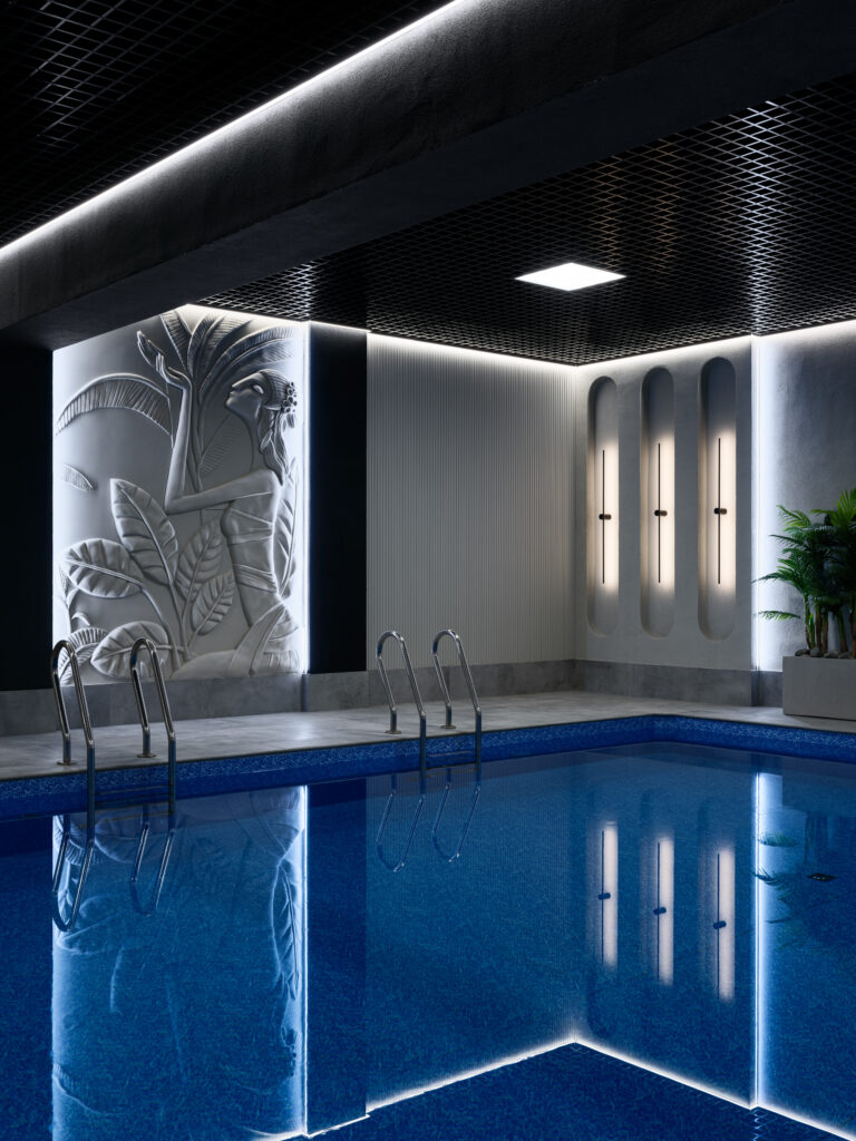 Банный комплекс «Центральные бани» — это крупный общественный проект площадью около 700 м², расположенный в историческом здании города. Работа над ним заняла два года, и в конце 2024 года комплекс открылся для посетителей. Перед студией стояла задача не стилизовать пространство под баню в привычном понимании, а создать современное пространство для отдыха. Помимо интерьерных решений потребовалась серьёзная инженерная переработка здания.