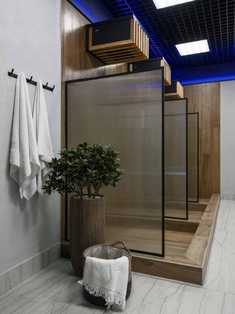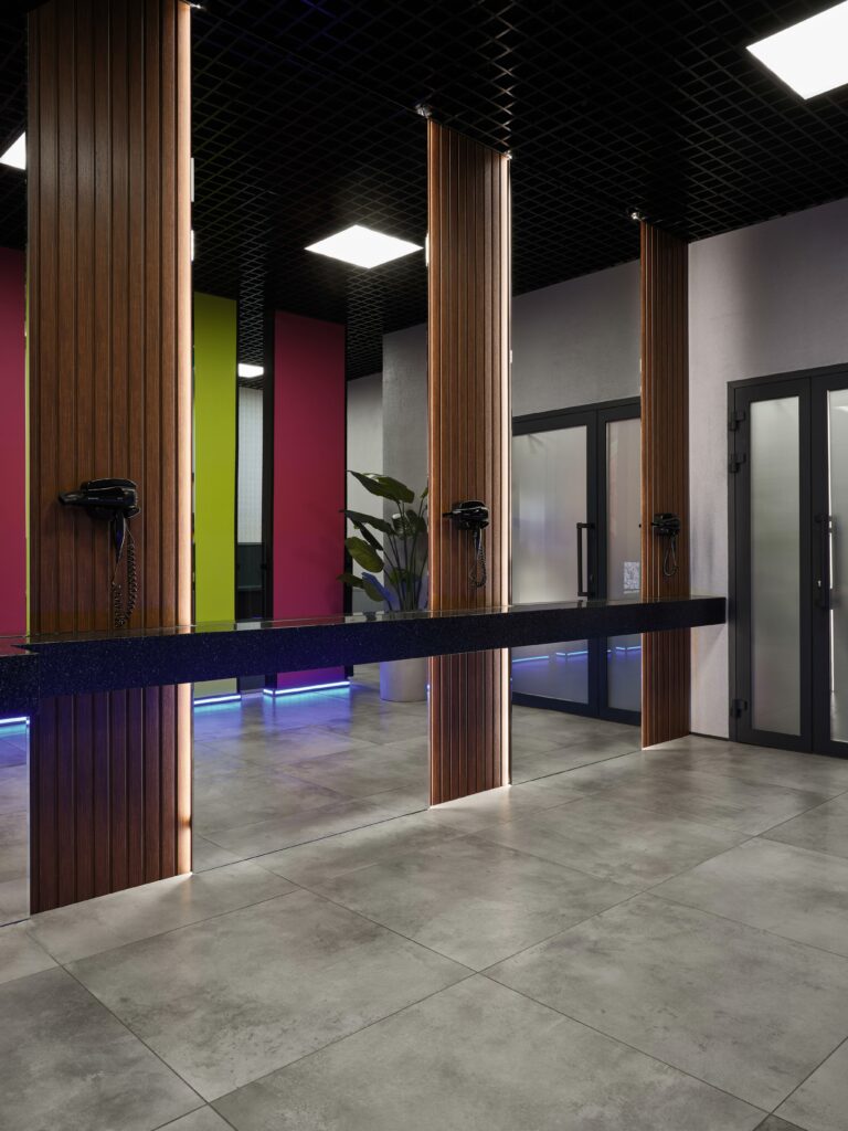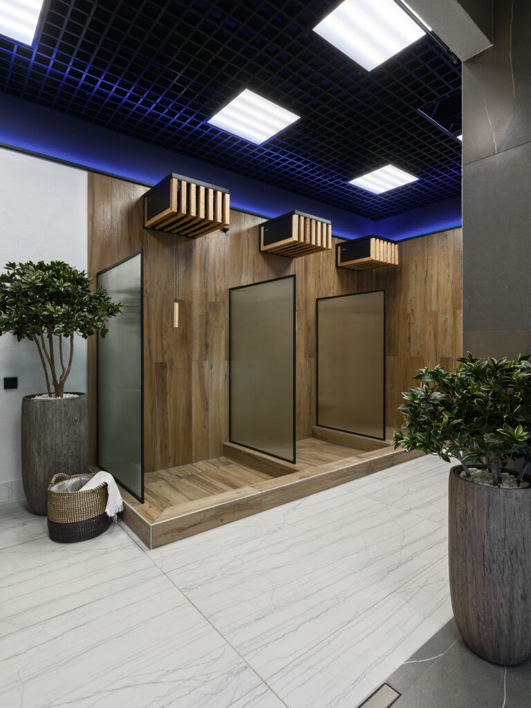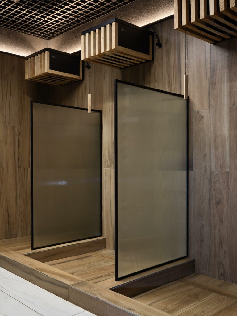 В мужском и женском отделениях керамогранит используется как основной отделочный материал. Он задаёт архитектурную основу пространства — в зоне бассейна, душевых, саунах и местах отдыха. Сочетание плитки Метрополис Аркадия Браун и светлого Шарм Эдванс Платинум Уайт формирует контрастную, но уравновешенную палитру, которая работает во всём комплексе. При общей фоновой базе атмосфера отделений заметно различается — и это особенно видно в работе с цветом мебели и акцентами.