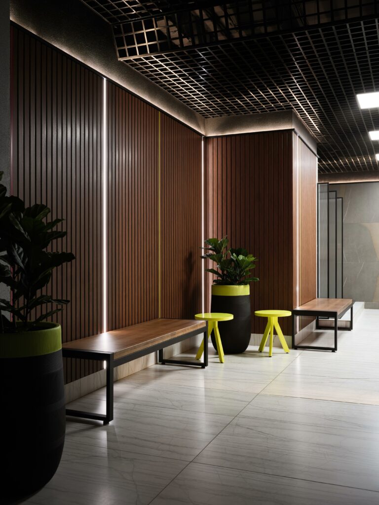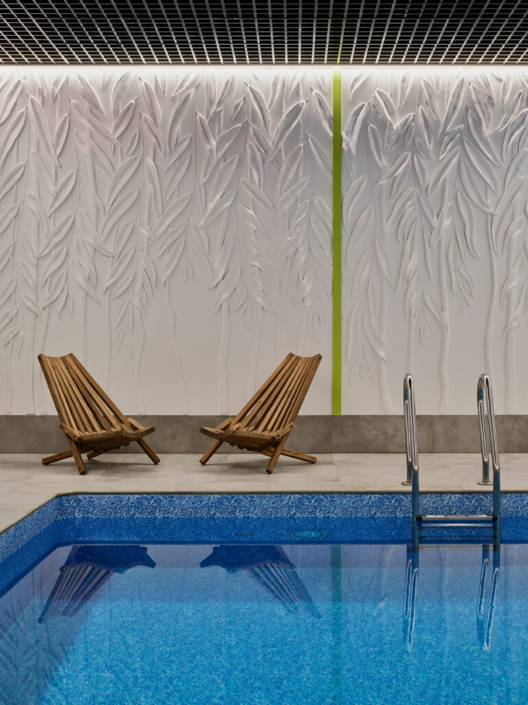 В женском отделении керамогранит под камень тёплого коричневого оттенка дополняют насыщенные цветовые акценты в мебели. Яркие диваны и кресла в зонах отдыха создают ощущение лёгкости и игривости. Интерьер не становится тяжёлым, наоборот, цвет добавляет ему живости. Белые барельефы у бассейна выступают дополнительным декоративным элементом и усиливают характер пространства, не перегружая его.
