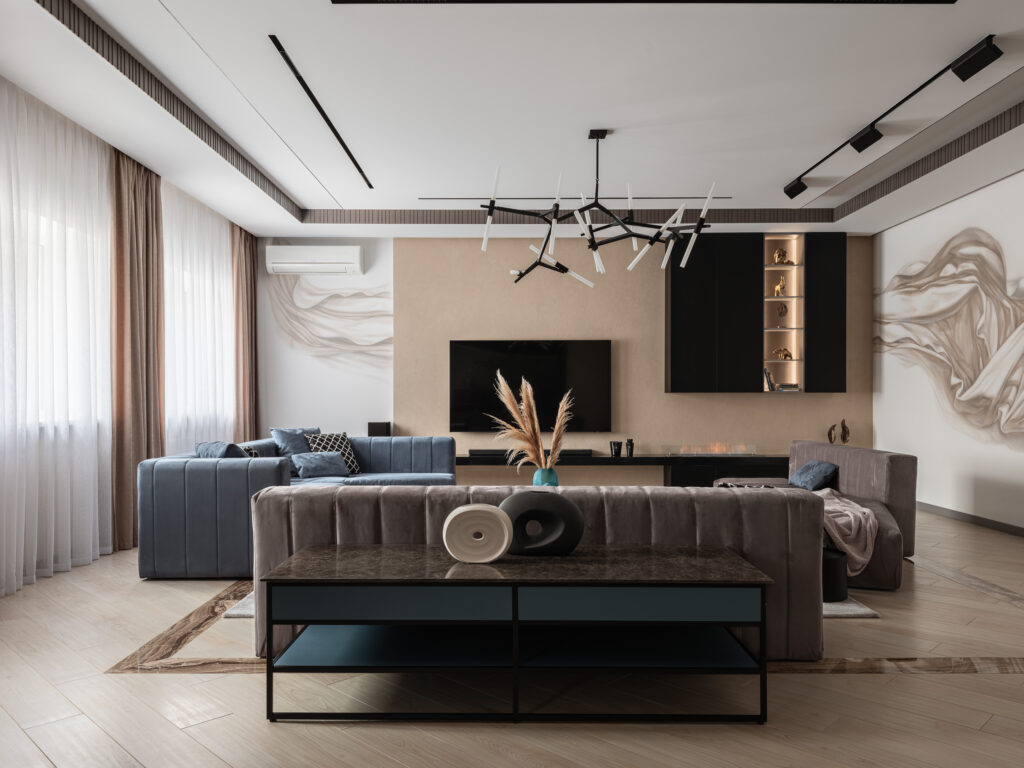 Композиционным центром стала гостиная с высоким потолком. Здесь сочетаются древесные фактуры и каменная база — дерево добавляет тепла, а более строгие поверхности удерживают масштаб и структуру. На одной из стен выполнена фреска по индивидуальному эскизу: она работает как тонкий художественный акцент и поддерживает лёгкость плоскости, не перегружая интерьер лишней фактурой.