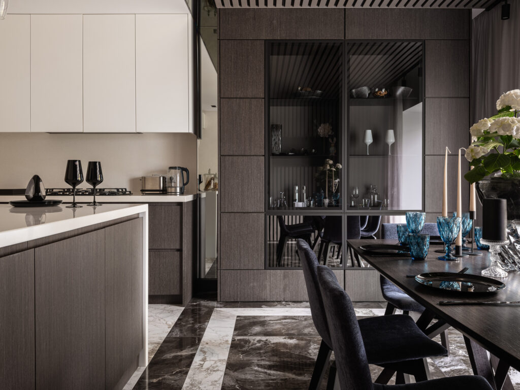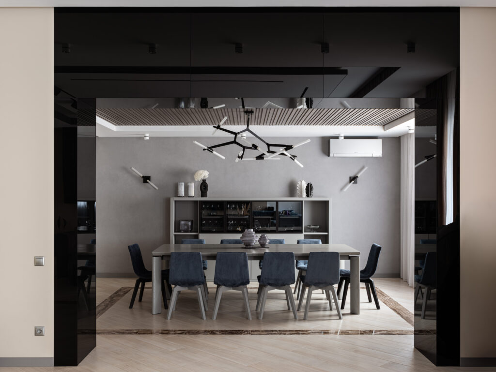 Так, низкие проёмы в высоких помещениях оформили чёрными стеклянными порталами «в потолок». Этот приём визуально вытягивает вертикаль и одновременно собирает переходы между зонами в единый ритм. Заказчики сначала сомневались из-за ухода за стеклом, но в готовом интерьере решение оказалось органичным.