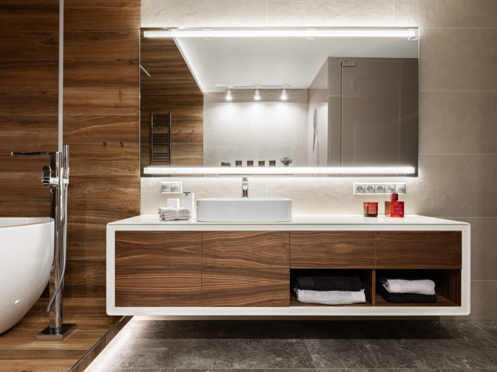 Именно мокрая зона полностью облицована керамогранитом под дерево Мезон Бренди 20х120 см — пол, стены и потолок образуют обволакивающий контур. Древесная текстура воспринимается не как декоративный акцент, а как самостоятельный архитектурный блок внутри помещения.
