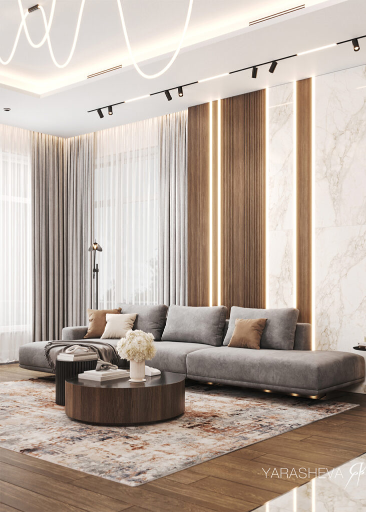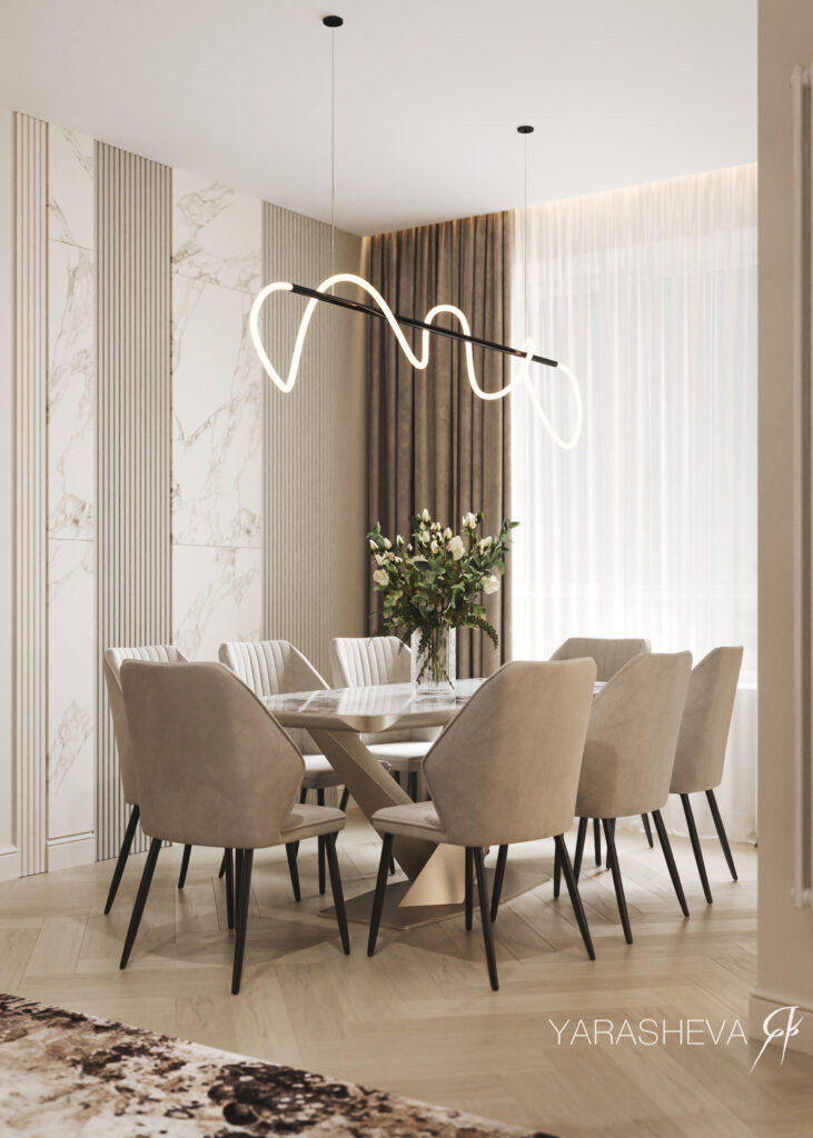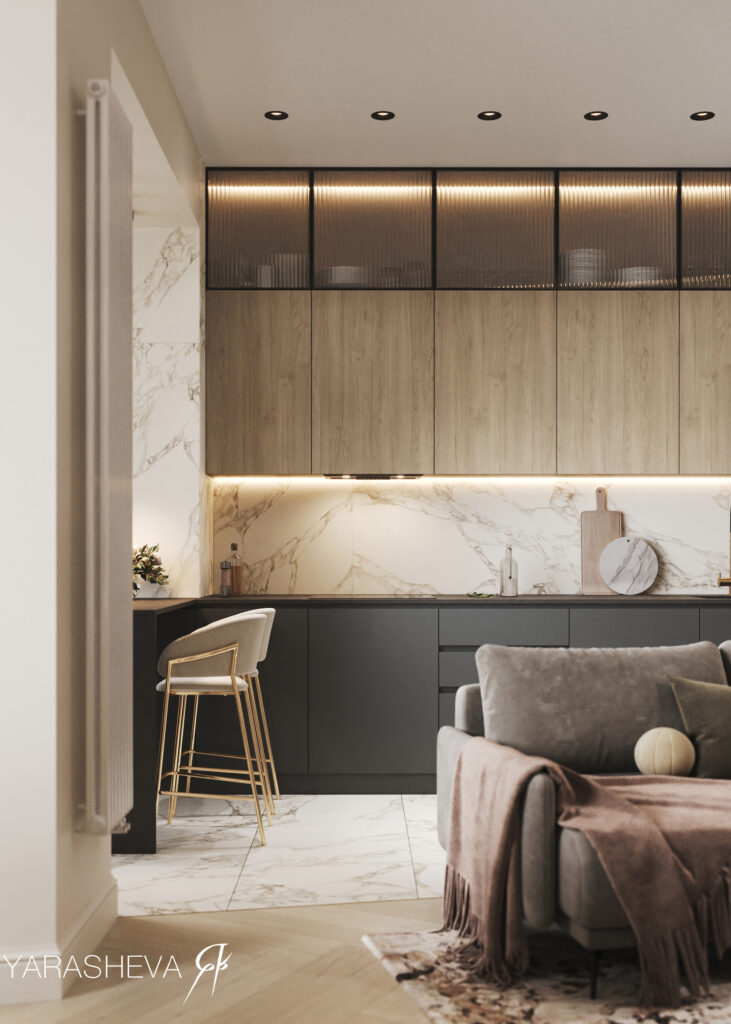 Яна отмечает, что со временем за Yarasheva Design Studio закрепилась репутация команды, уверенно работающей с цветом. При этом сама дизайнер признаётся, что лично ей ближе спокойная, нейтральная палитра — такая, которая не отвлекает глаз и не перегружает восприятие. Тем не менее запросы клиентов нередко оказываются смелее: в проектах появляются активные цветовые акценты и разные цветовые сценарии для отдельных помещений. В таких случаях особенно важно собрать все оттенки в единую систему, чтобы интерьер оставался цельным и уравновешенным.