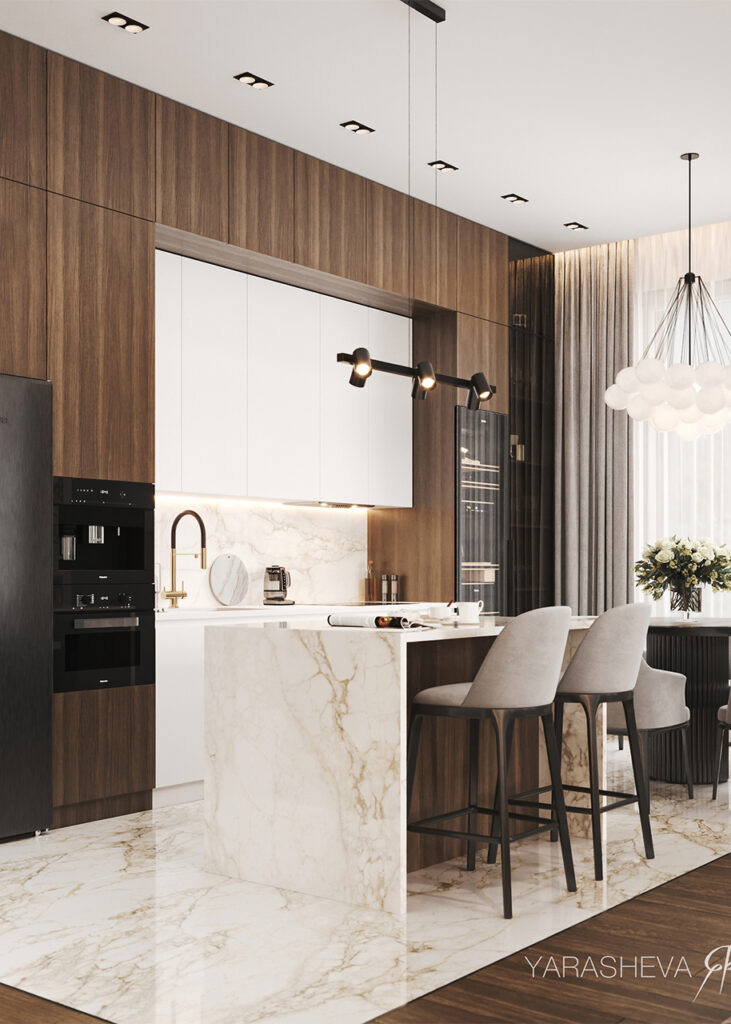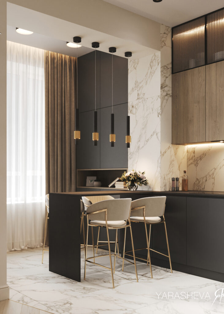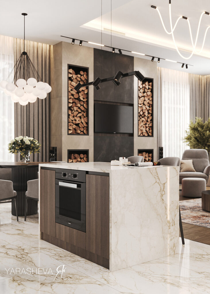 В облицовке кухни‑гостиной на полу, кухонном фартуке и в декоративных вставках использован керамогранит Шарм Делюкс Арабескато Уайт. Светлая мраморная поверхность объединяет разные функциональные зоны в единое пространство. Дополнительный акцент задают золотистые элементы в светильниках и деталях мебели. Они добавляют интерьеру ощущение сдержанной роскоши и подчёркивают парадный характер общей зоны, не делая его избыточным.