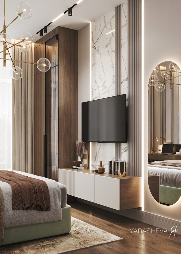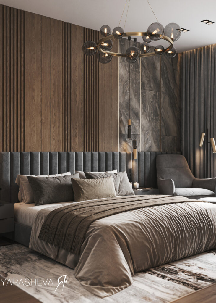 В спальной части интерьер становится более спокойным и уравновешенным. В мастер‑спальне ключевую роль играет сочетание глубоких темных оттенков и выразительных фактур: керамогранит под мрамор Шарм Делюкс Гриджио Оробико сочетается с мягким текстилем, деревом и тёплым рассеянным светом, создавая камерную и расслабляющую атмосферу. Это пространство выстроено как место для отдыха — без визуального напряжения, но с ощущением характера.