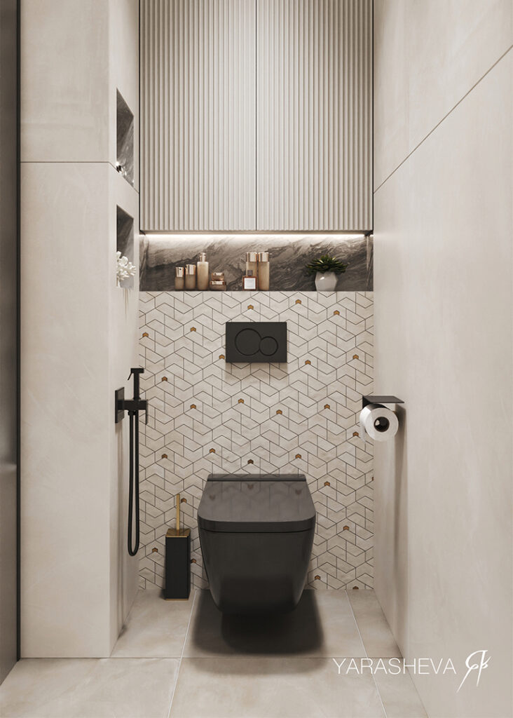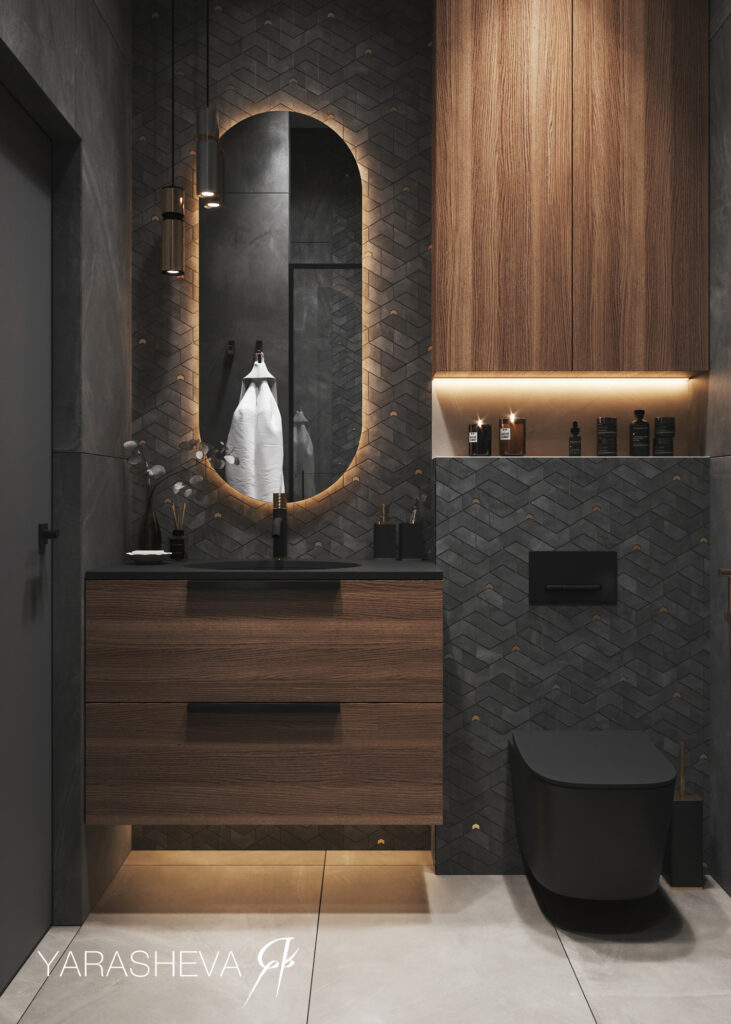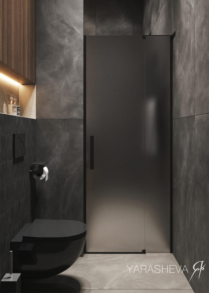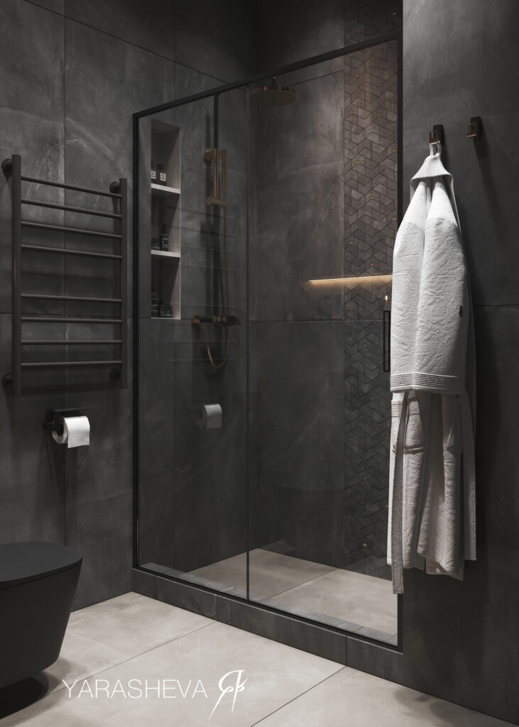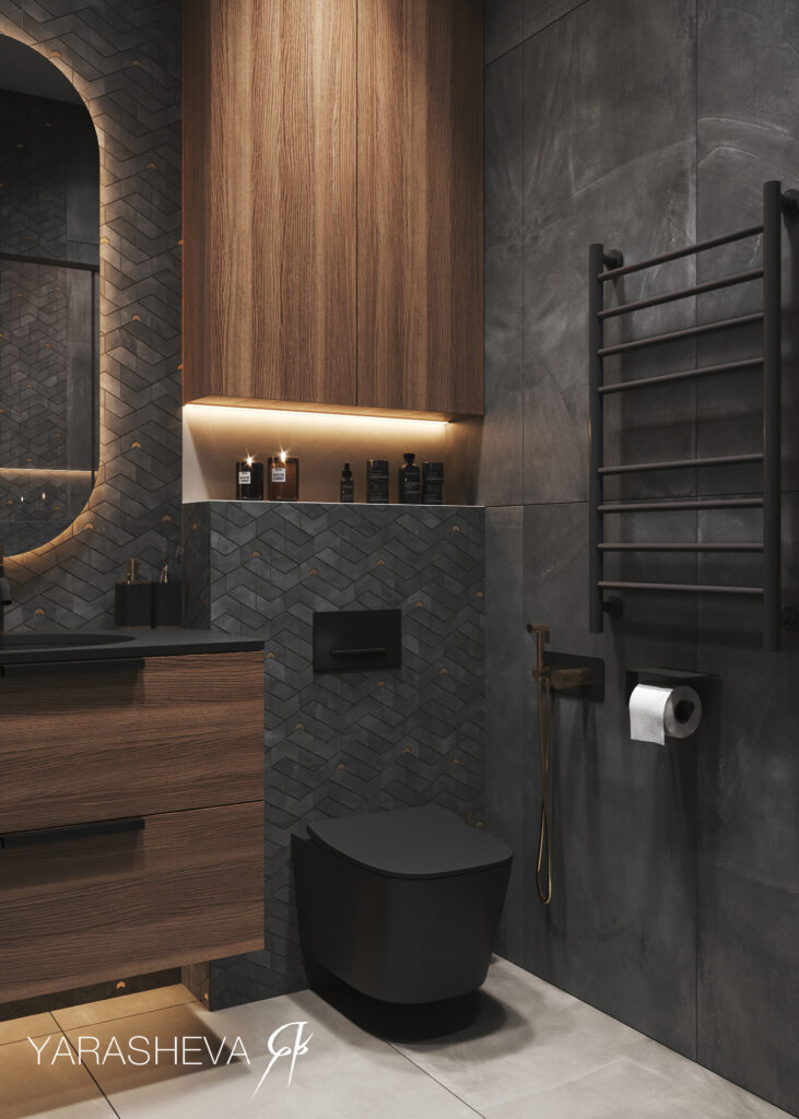 Санузлы поддерживают общую логику проекта. Мастер‑санузел выполнен в тёмной гамме с использованием керамогранита под бетон Континуум Петрол 60х120 и графичной мозаики Джуэл — по настроению он близок к спальне и остаётся сдержанным и функциональным. Детский санузел реализован в более светлой палитре: здесь важны простота, визуальная лёгкость и комфорт для повседневного использования.