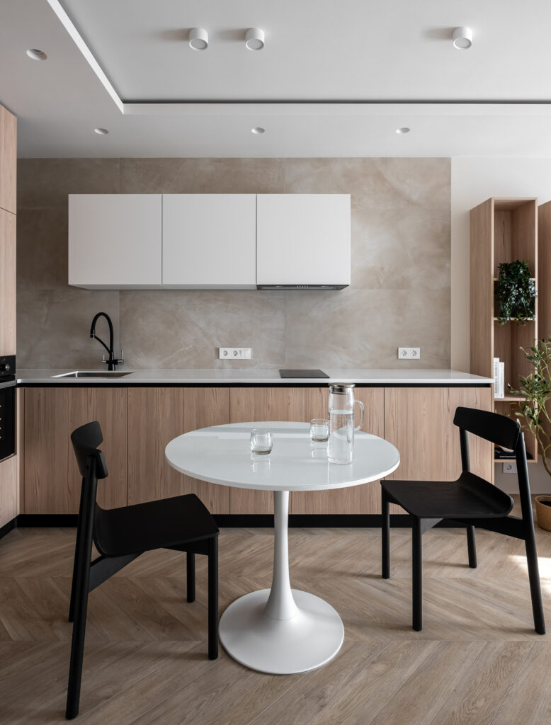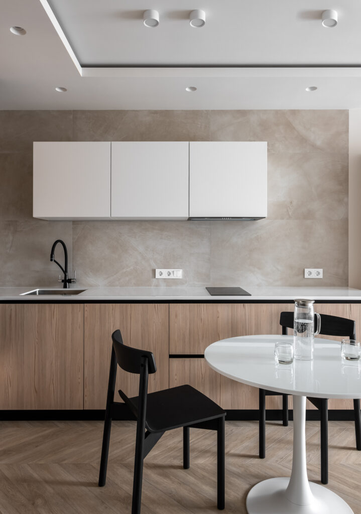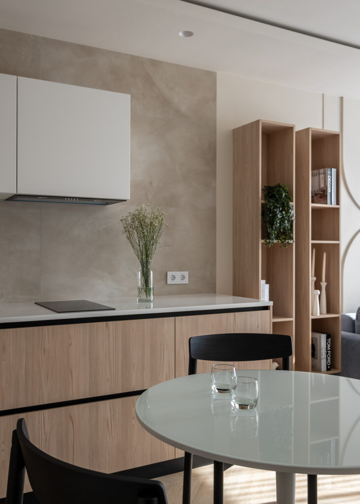 Кухня с минимальным количеством верхних шкафов и контрастными фасадами – белыми и под дерево – смотрится легко и гармонично в общей композиции. Для облицовки фартука выбрали плитку с эффектом наливного пола Continuum Pure 60×120 nat. Она отлично подошла по стилю и стала надежной защитой поверхности в рабочей зоне.
