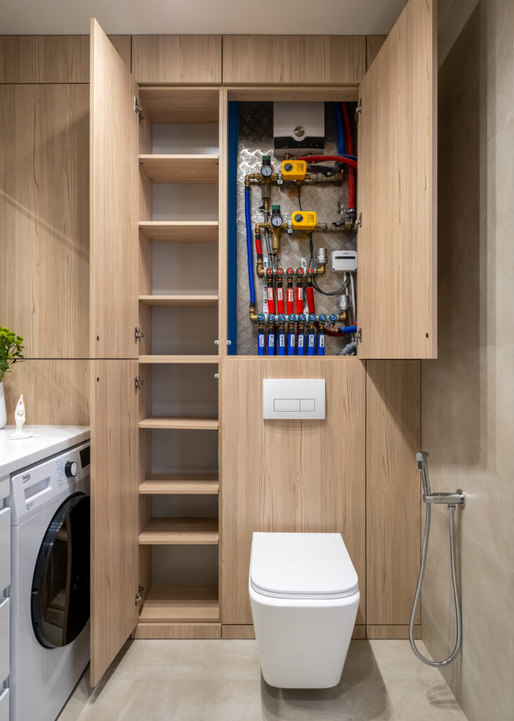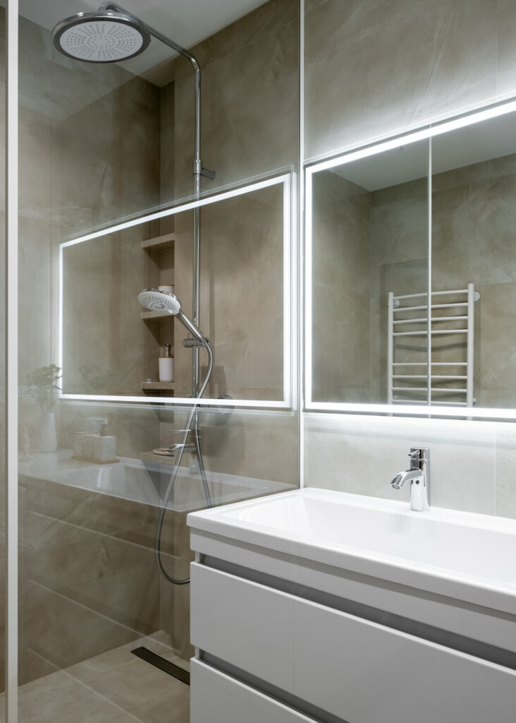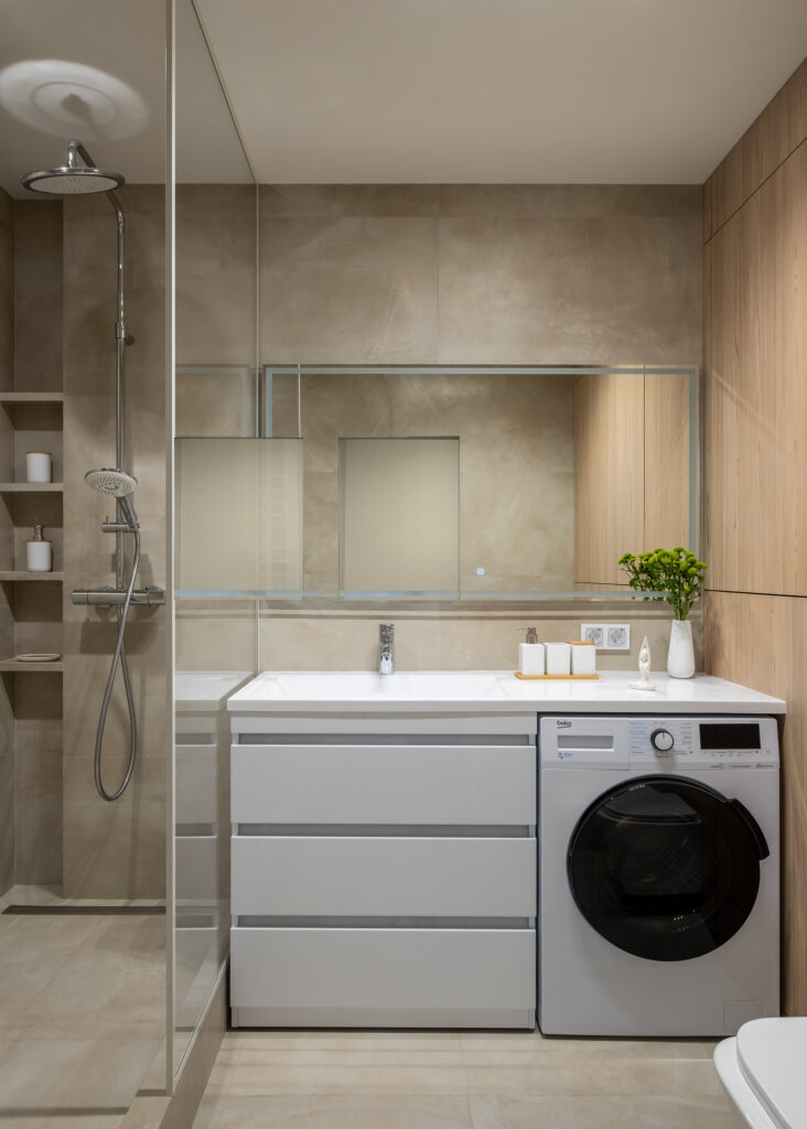 В санузле все продумано так, чтобы интерьер оставался визуально легким и удобным в быту: одинаковый керамогранит — Continuum Pure — на стенах и на полу в формате 60х120, сантехника в цвете хром и встроенная мебель с фасадами под дерево. В квартире с таким дизайном арендаторам будет легко почувствовать себя по-настоящему дома.