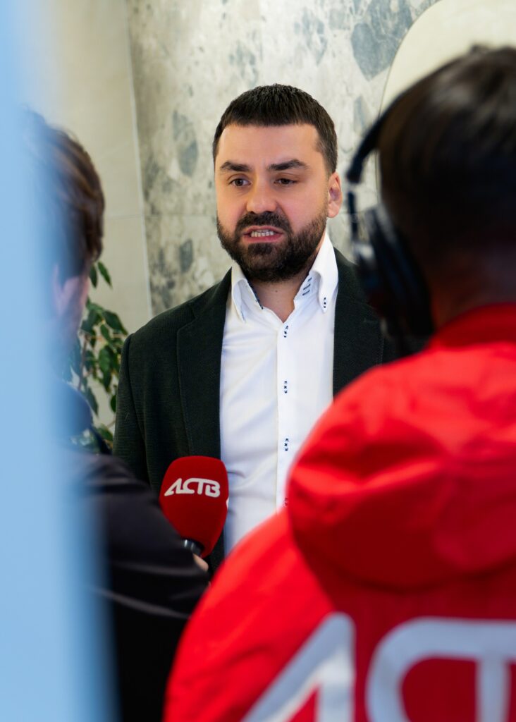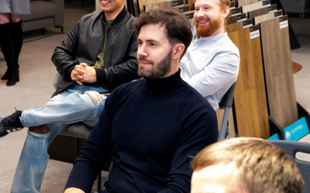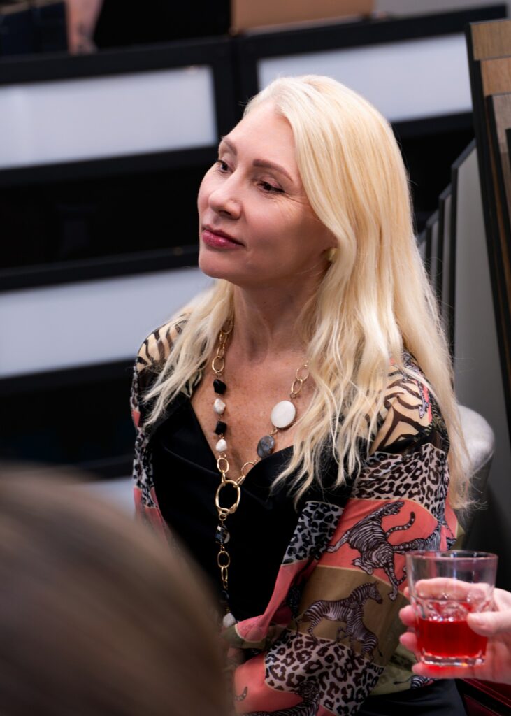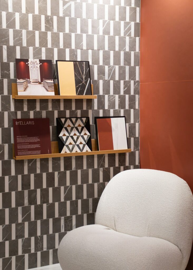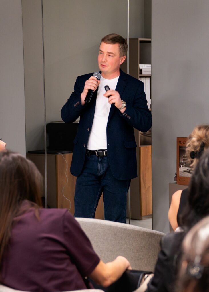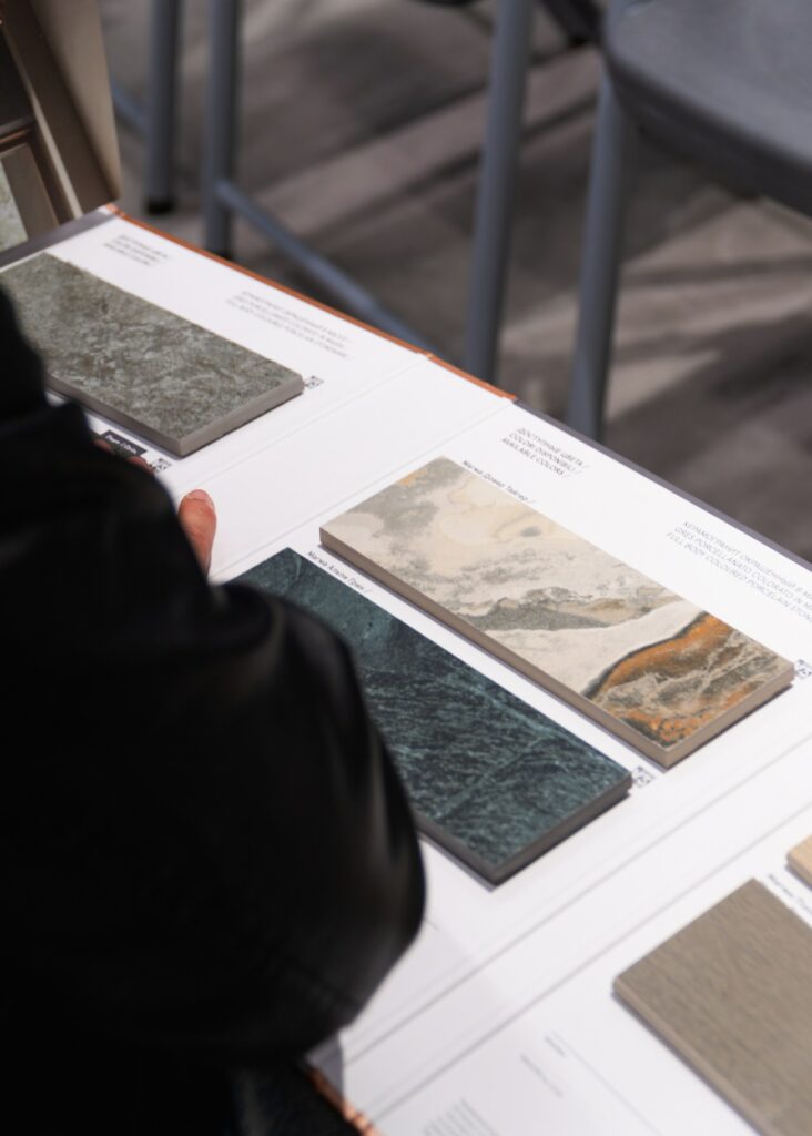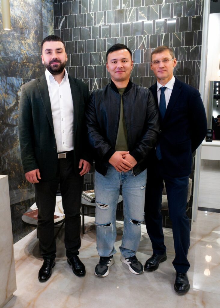 Владимир поделился с публикой опытом посещения международной выставки Cersai-2025 в этом году, куда каждый год отправляется команда от Italon, чтобы лучше понимать тенденции и возможности рынка керамики. Сергей же в свою очередь снял завесу тайны с новой коллекции, представив во всей красе плиту, главным вдохновителем которой стал магический по своей структуре камень – кварцит, который, как заметил Сергей, величественно украшает саркофаг гробницы Наполеона Бонапарта.